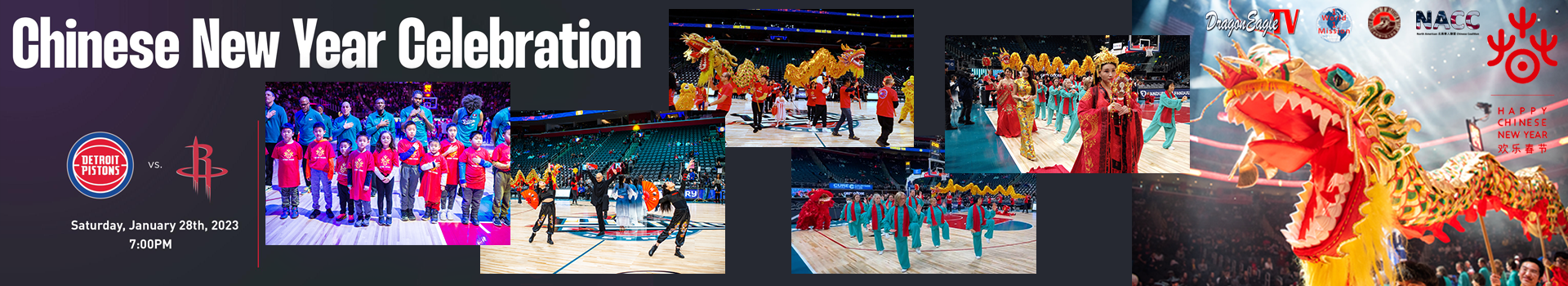 2023年1月28日,NBA活塞队、底特律市政府、龙鹰卫视、北美华人联盟密西根(NACC-MI)和底特律中国人协会(CAGD)共同举办第七届NBA活塞队 “欢乐春节中国之夜”, 活动将在LITTLE CAESARS ARENA(小凯撒球馆)举行。届时底特律活塞队对阵休斯顿火箭队。