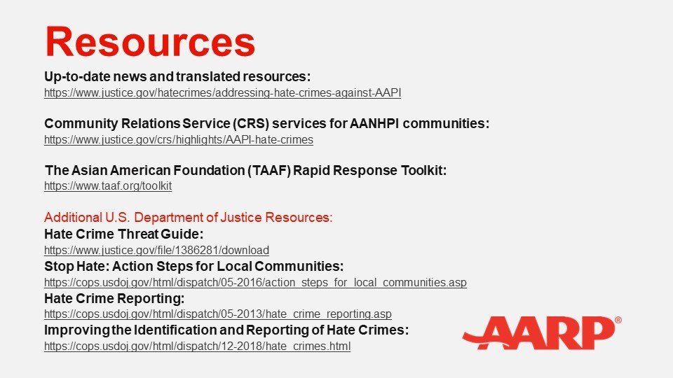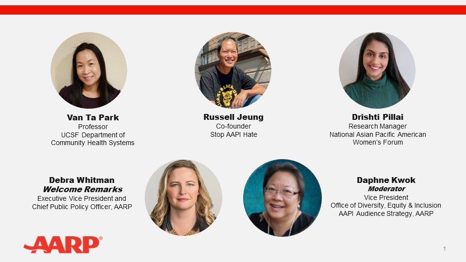 在8 月 25 日,AARP 举办了一个虚拟小组 - 『AARP #StopAsianHate Panel: Backing Up Our AAPI Elders With Data』- 从数据的角度关注反亚裔仇恨问题。该活动包括研究专家就 AAPIs 50-Plus 的最新问卷调查结果发表演讲,随后进行小组讨论,主题包括 COVID-19 对AAPI 长者的心理和健康影响、AAPI 仇恨事件的自我报告以及影响AAPI 女性 50 岁以上的仇恨事件。