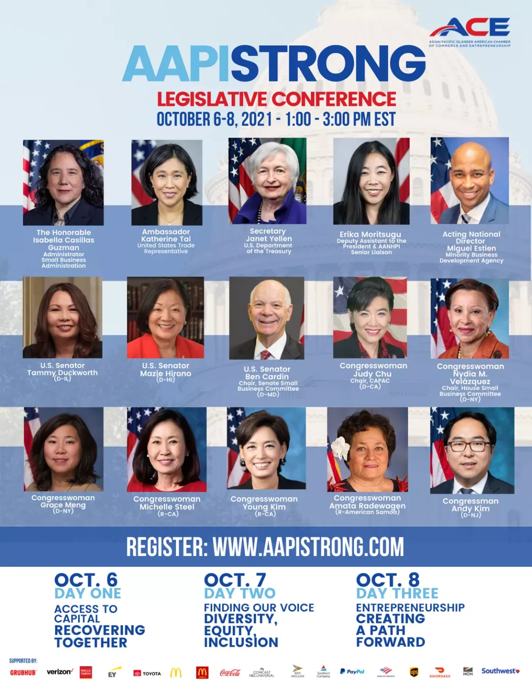 全美亚裔总商会「亚裔中小企业政策研讨高峰会」, 即将于2021年10月6-8日在线上举行, 会议将与国会领袖及拜登政府内阁部长共同研讨, 改善中小企业经营环境。包括资金获取,亚裔共同坚强对抗仇恨犯罪,未来企业成长方向等。