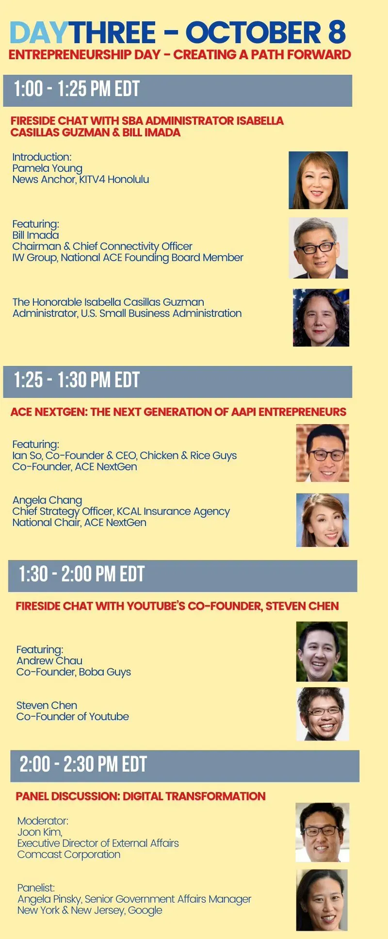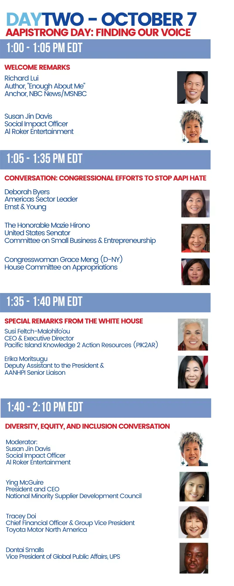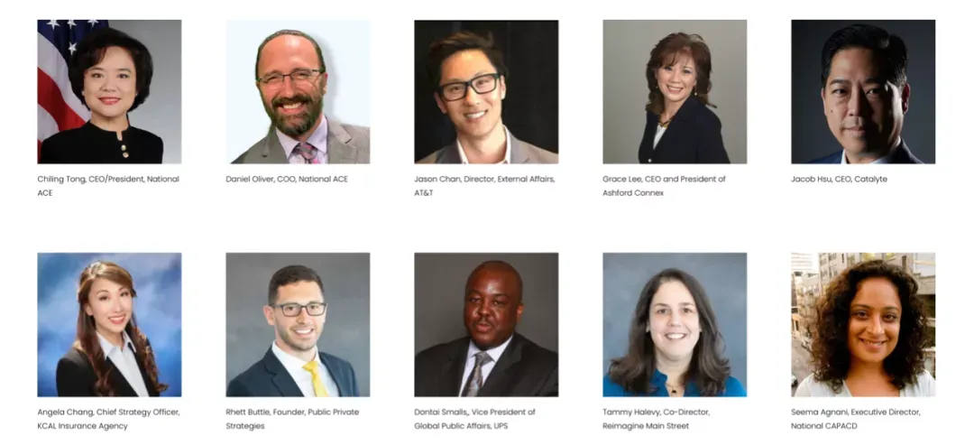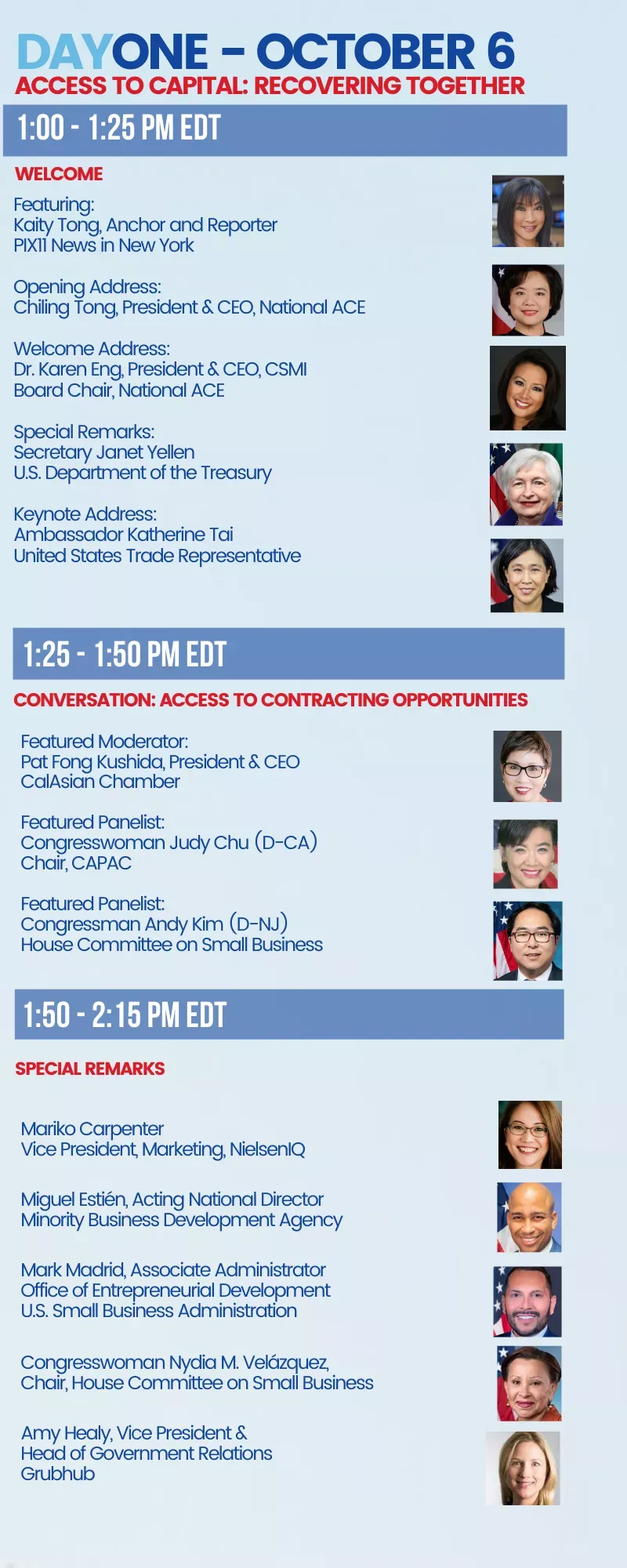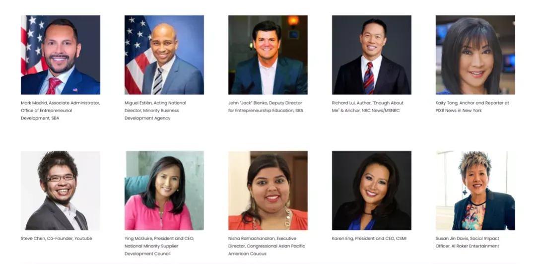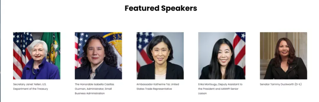 部分重磅演讲嘉宾: 财政部长叶伦,美国贸易代表戴琪,中小企业局局长Isabella Guzman,联邦参议员谭美·达克沃斯(Tammy Duckworth),广野庆子(Mazie Hirono),Ben Cardin ,联邦众议员兼小企业委员会主席Nydia M. Velázquez,赵美心,孟昭文,Andy Kim,金映玉等以及少数族裔企业发展署执行署长Miguel Estién等