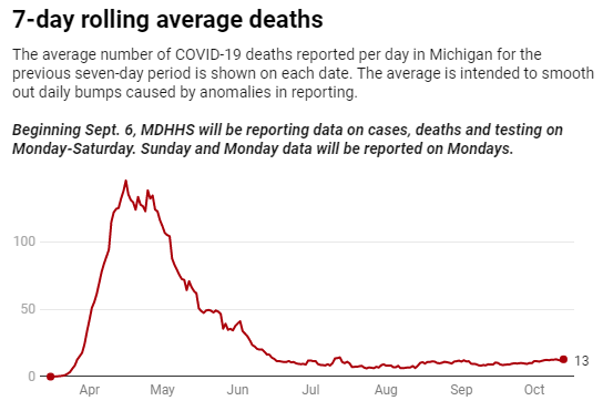 从9月6日开始,密歇根州卫生与公众服务部(MDHHS)将在周一至周六报告病例、死亡和测试的数据。周日和周一的数据将在周一报告。