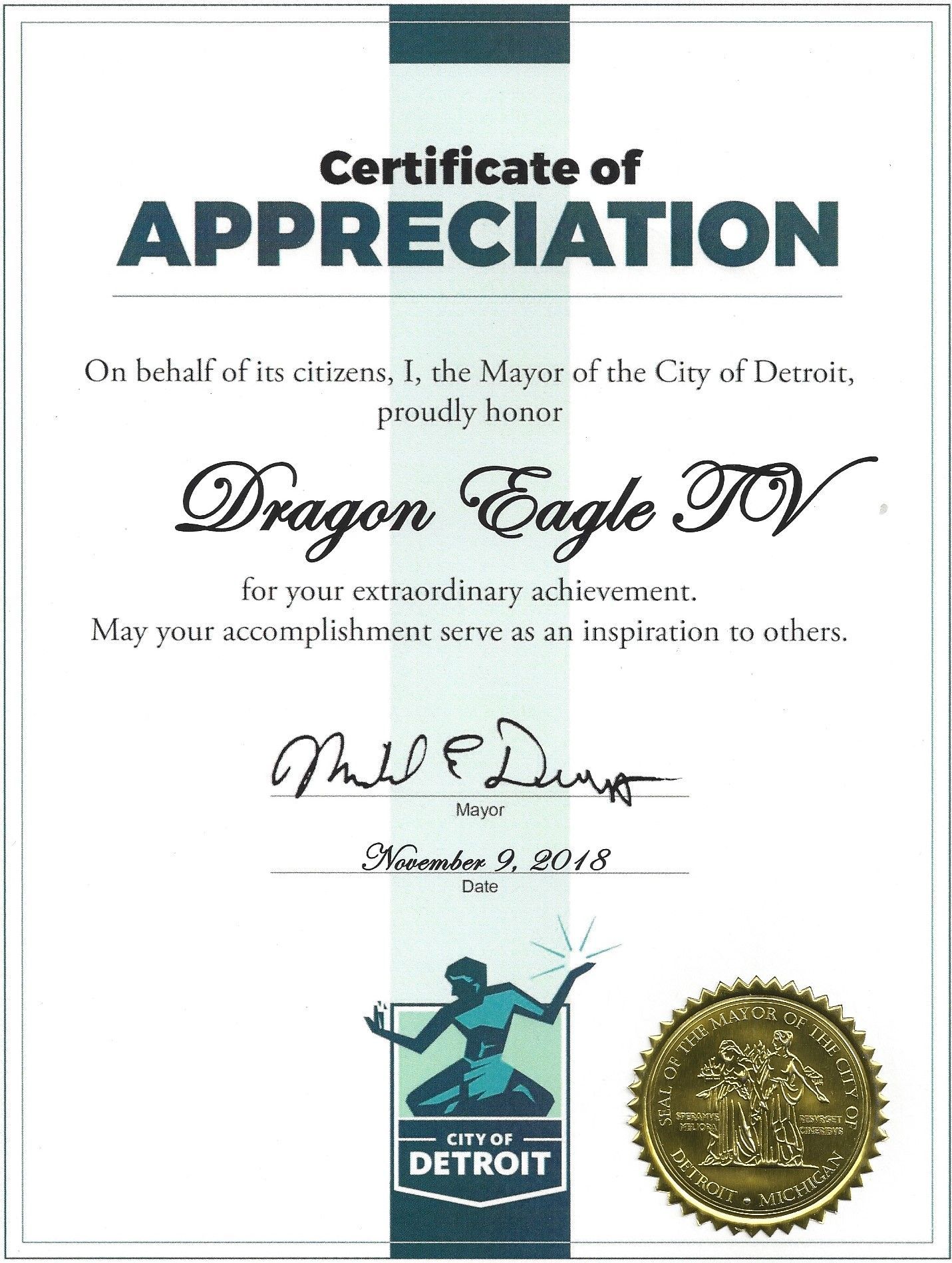 底特律市长嘉奖龙鹰卫视荣誉证书