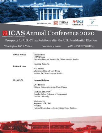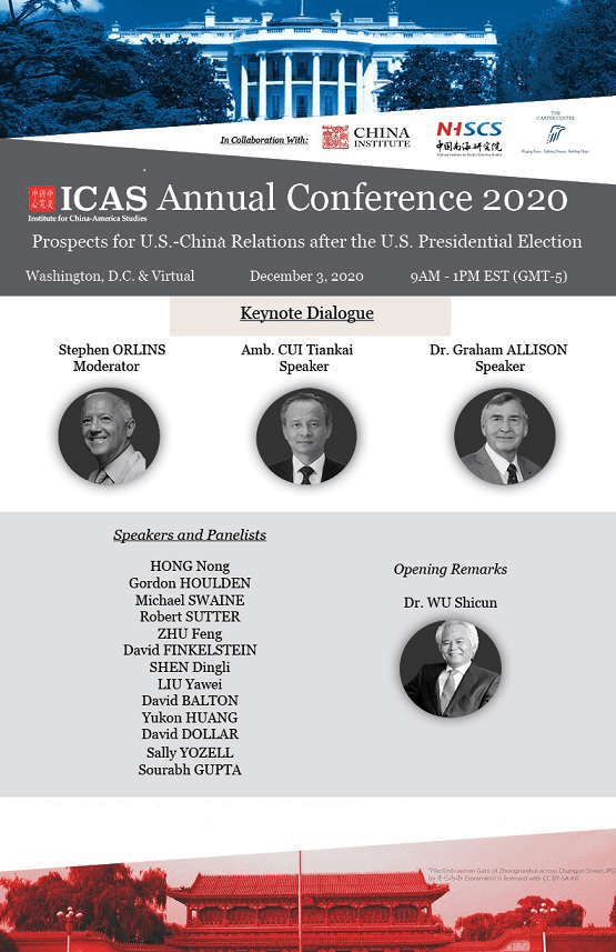由中美研究中心主办、中国南海研究院、加拿大阿尔伯塔大学中国学院和美国卡特中心协办的“展望美国大选后的中美关系”研讨会将于美国东部时间12月3日上午9点在线举行。在开幕式上,美中关系全国委员会主席 欧伦斯 将主持中美驻美大使 崔天凯 与哈佛大学教授 埃里森 的对话。之后,研讨会将就“美国新政府下的中美战略博弈”(Outlook for U.S.-China Strategic Rivalry During Next Administration)和“新形势下中美在经济贸易、科技及环境等领域的互动”(Outlook for U.S.-China Engagement on Trade, Technology and Environment During Next Administration)举行两场讨论。