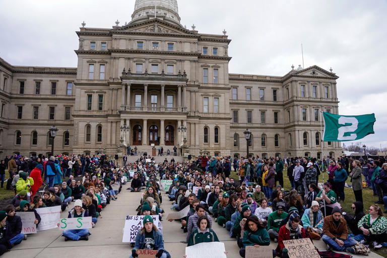 Feb. 15 Students take part in a silent-sit during a rally in front of the Michigan State Capitol in Lansing.