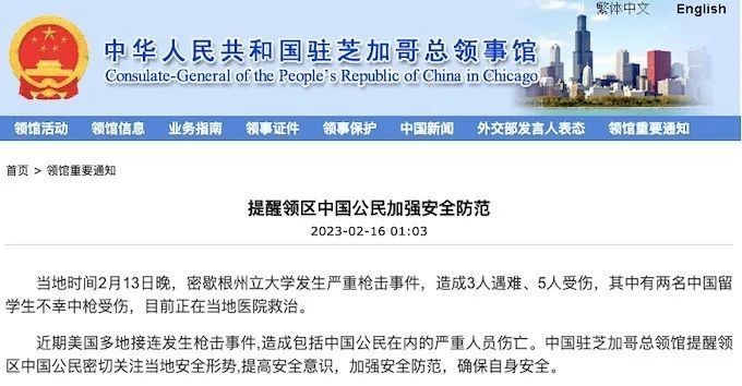 中国驻芝加哥总领馆发布公告,确认中国留学生受伤,提醒公民注意安全防范