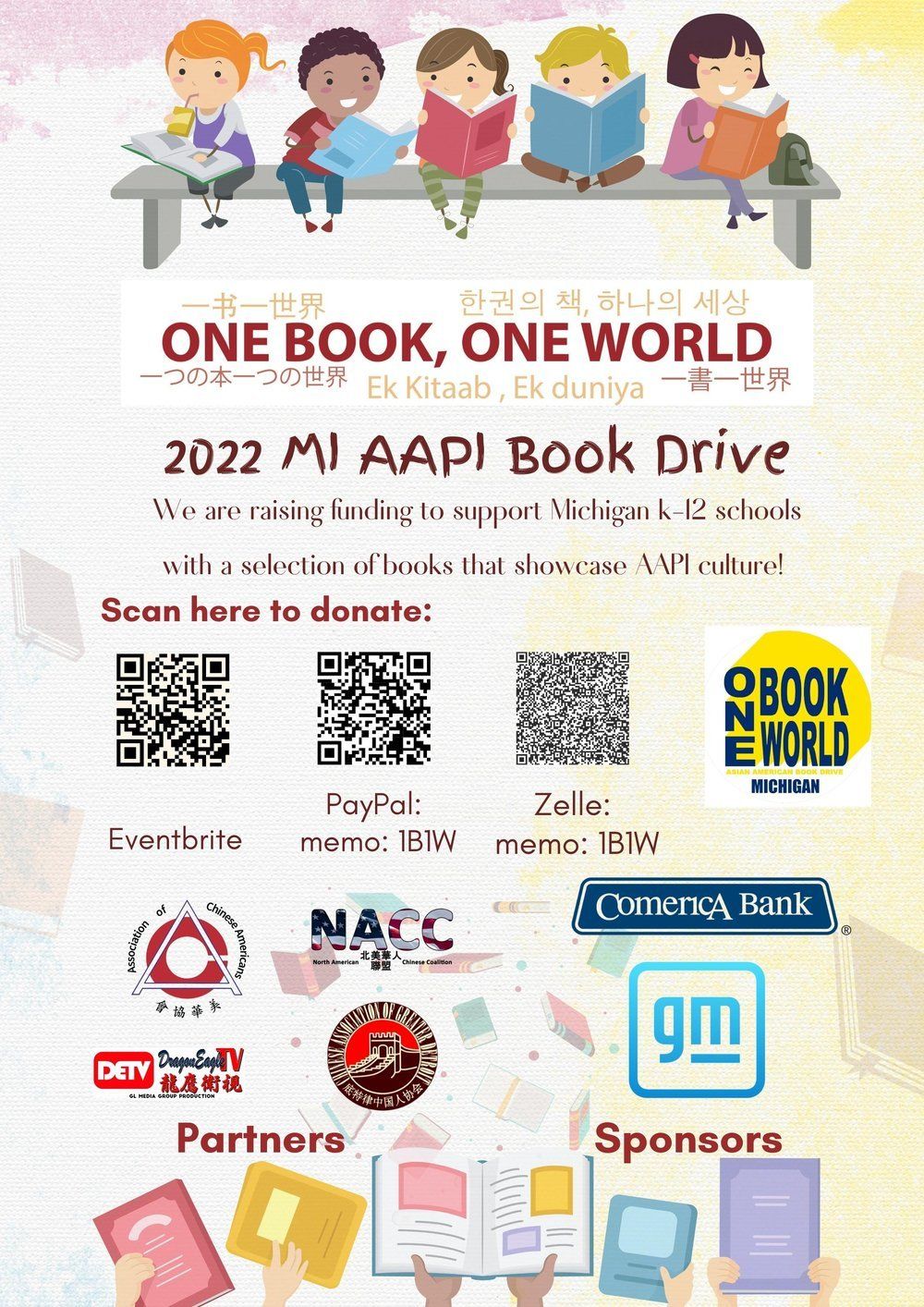 Alexia Xu: The One Book One World Michigan project brings books about Asian heritage to K-12 public schools in Michigan. Their goal is to promote awareness of different Asian cultures through books. This project is sponsored by GM and Comerica, and it has a partnership with Association of Chinese Americans, North American Chinese Coalition, Dragon Eagle TV, and Chinese Association of Greater Detroit. The One Book One World project donated 50 books to the school FLICS, and sponsorship and partnership volunteers read books to the students there.