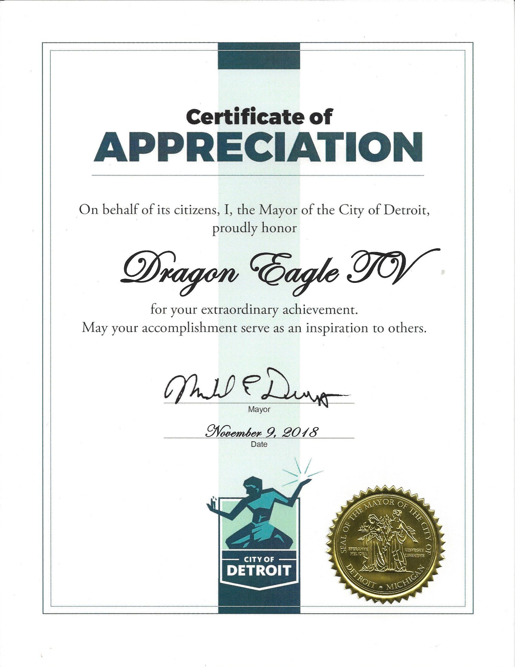 Dragon Eagle TV is proud to be recognized by the City of Detroit