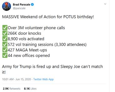 川普的競選經理布拉德·帕斯卡爾(Brad Parscale)早些時候發了一條推文: