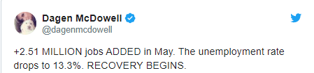 五月份創造了251萬個工作崗位。失業率降至13.3%。經濟復甦開始。