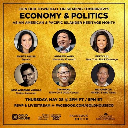 金屋(Gold House)举办了一个关于经济和政治的虚拟市政厅,演讲者从左上到右分别是:MSNBC主持人Richard Lui; Square首席财务官Amrita Ahuja; 2020年前总统候选人安德鲁·杨(Andrew Yang);纽约证券交易所常务副主席贝蒂·刘; MSNBC主持人Richard Lui; TDW Co创始人兼负责人王添和Define American的创始人Jose Antonio Vargas。