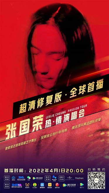 为缅怀哥哥并还原其艺术舞台,2022年4月1日晚上8点,腾讯音乐娱乐集团携手环球音乐旗下厂牌宝丽金,并联合腾讯云、微信视频号、腾讯视频等多个团队联合呈现“张国荣2000年《热·情》演唱会超清修复版”全球首播。